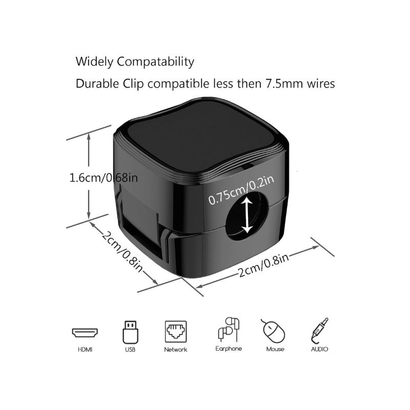 - Diamètre de 0,3 pouces (7,5 mm) peut contenir la plupart des câbles, tels que les câbles de chargement de téléphone, les cordons USB, les cordons d’alimentation d’ordinateur, etc. En plus de cela, le diamètre de la fente de 7,5 mm peut parfaitement contenir une tête de chargement aussi petite comme le câble sans tomber.