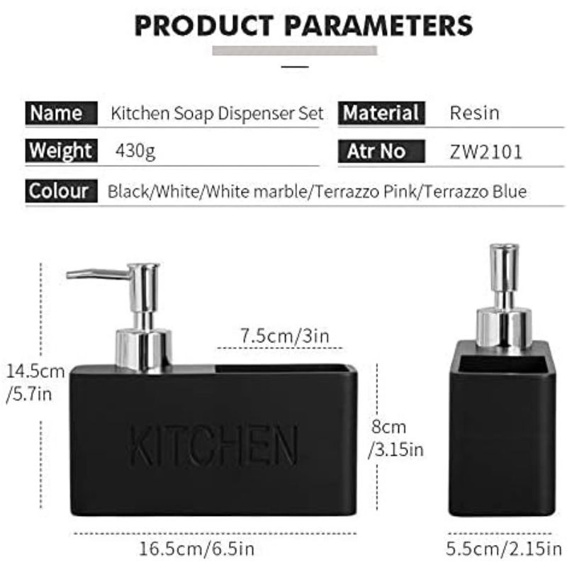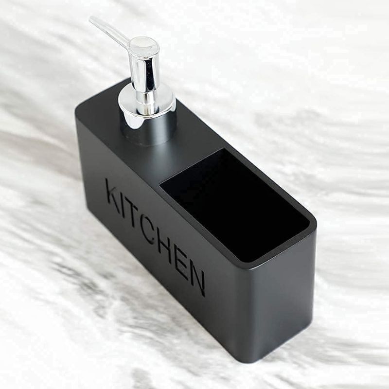Optimisez votre espace de cuisine avec ce distributeur de savon pratique, accompagné d’un porte-éponge intégré.